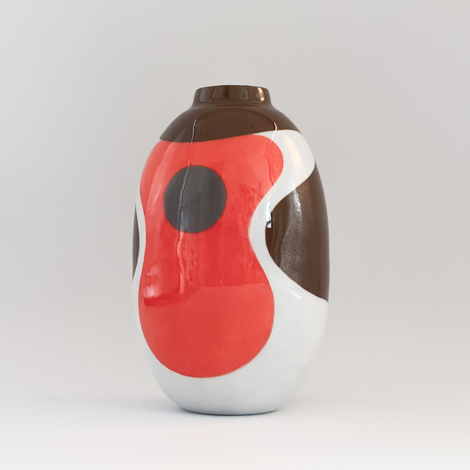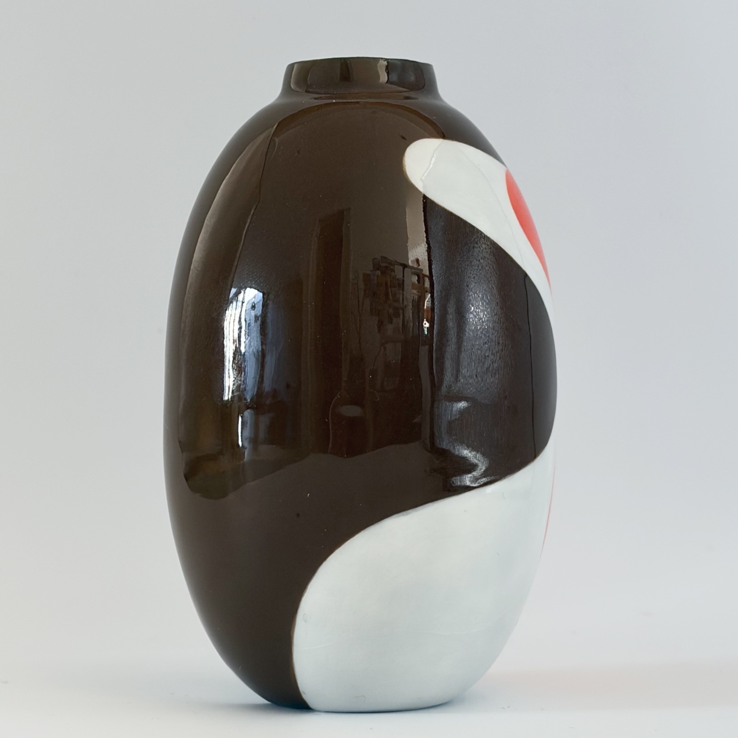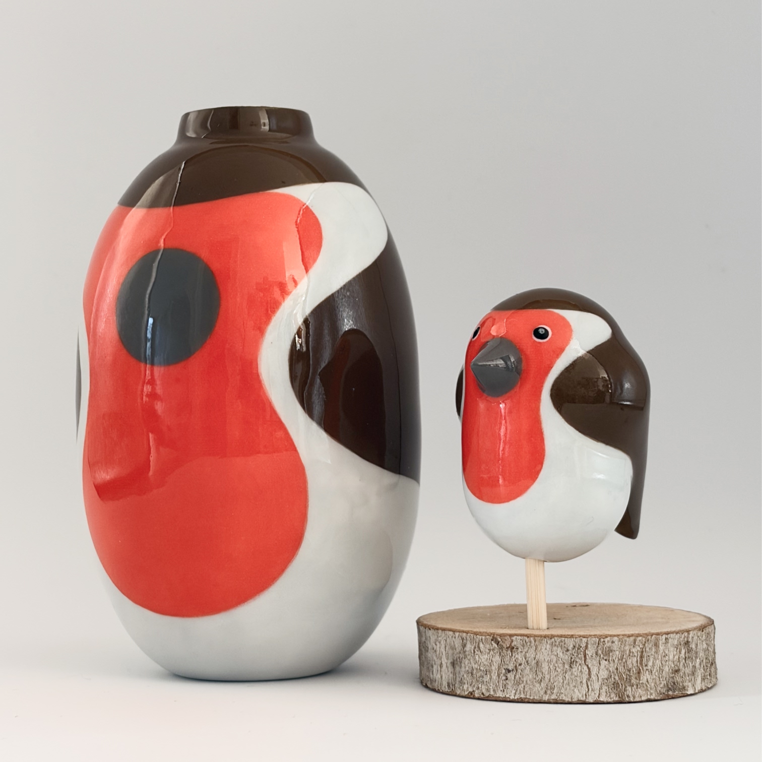 Small porcelain vase with a decoration of a big robin, painted with lots of care and dipped in a glossy transparant glaze.