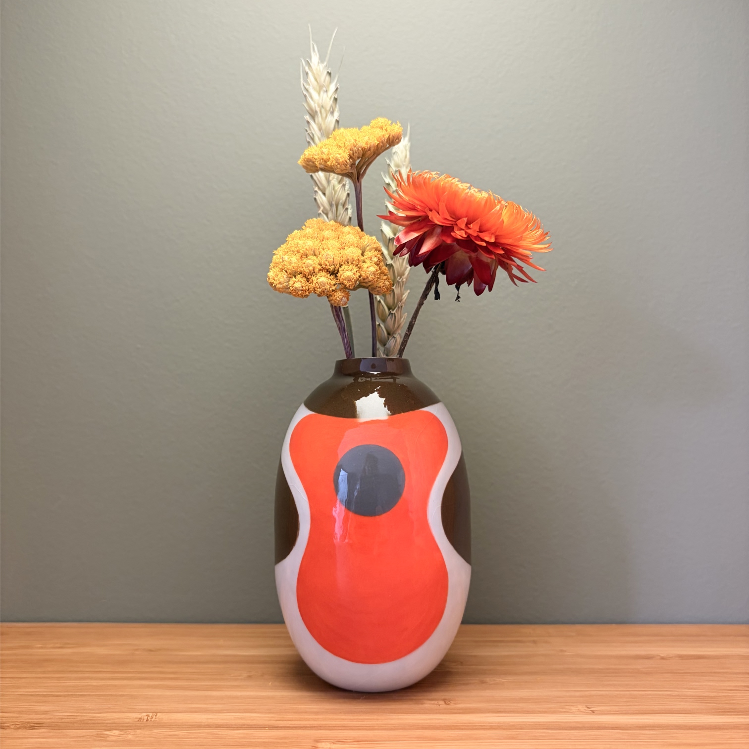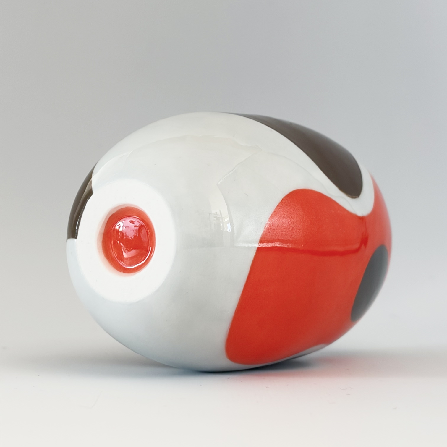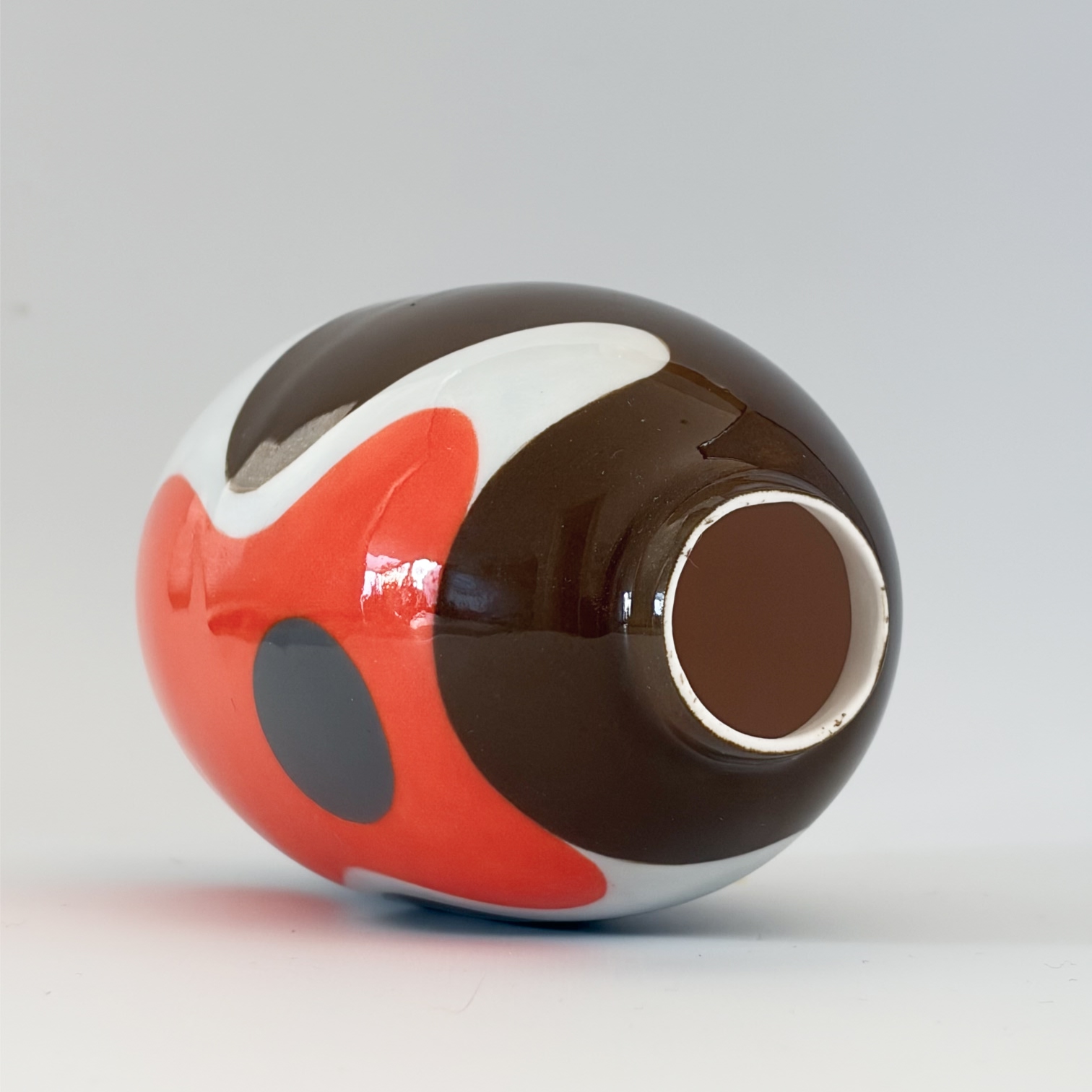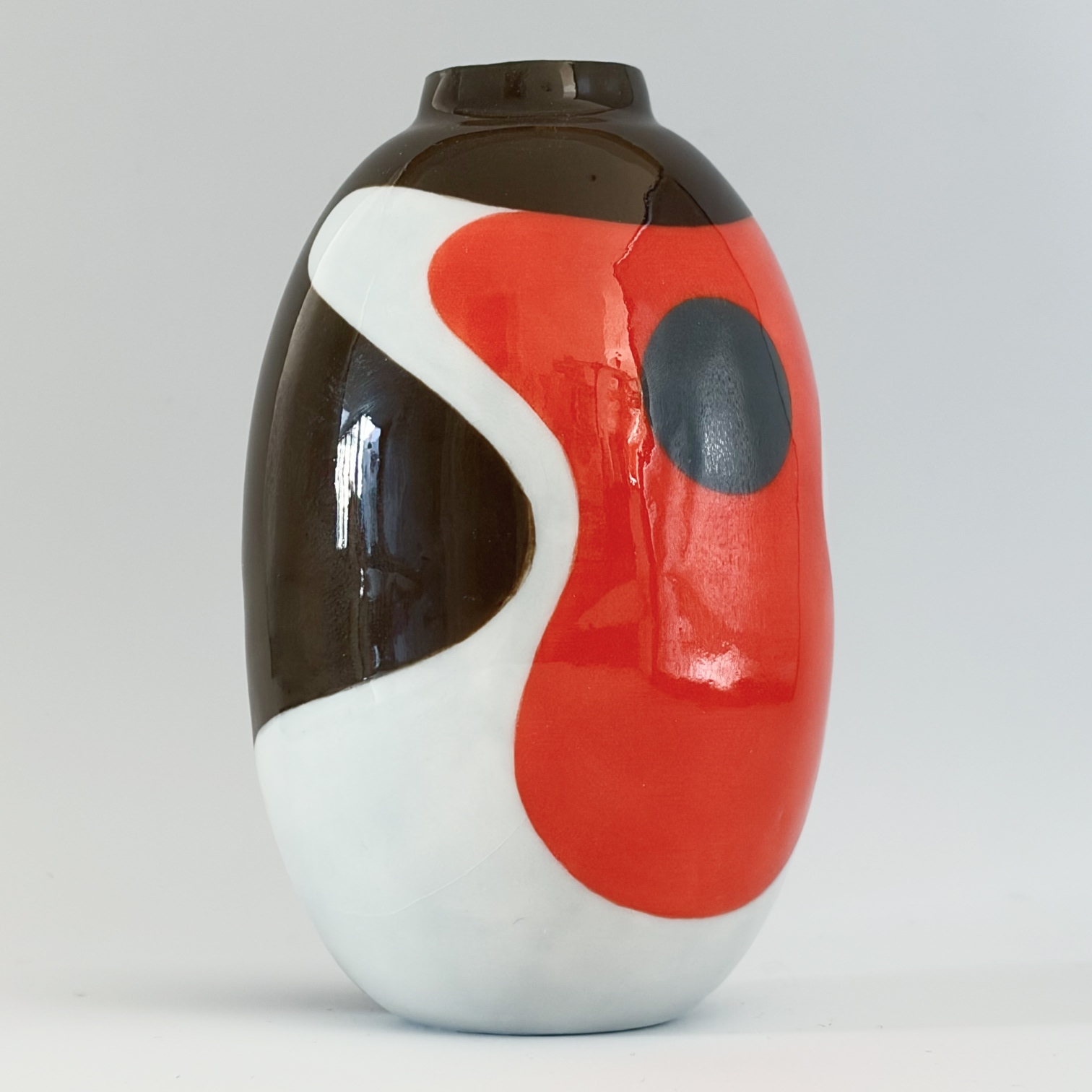 Small porcelain vase with a decoration of a big robin, painted with lots of care and dipped in a glossy transparant glaze.