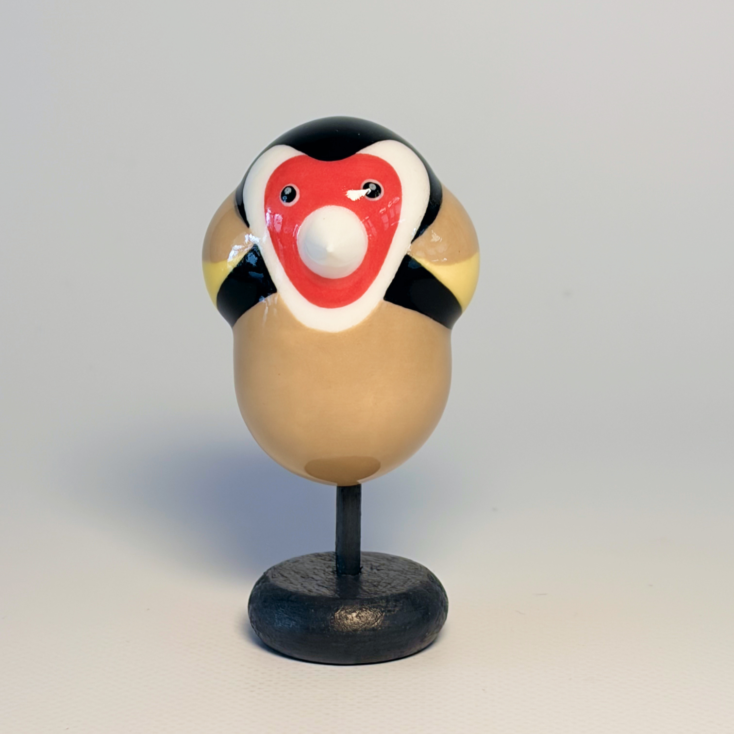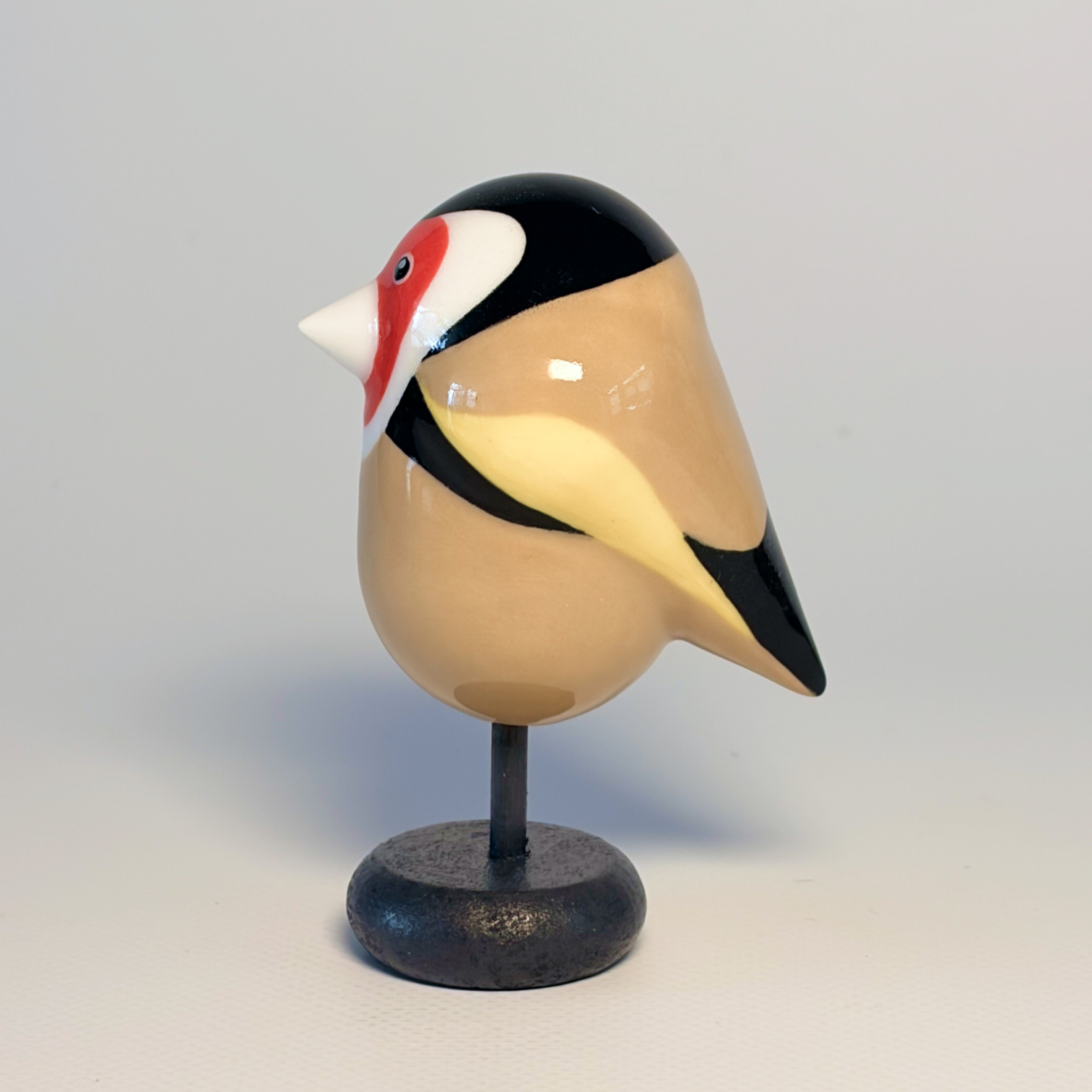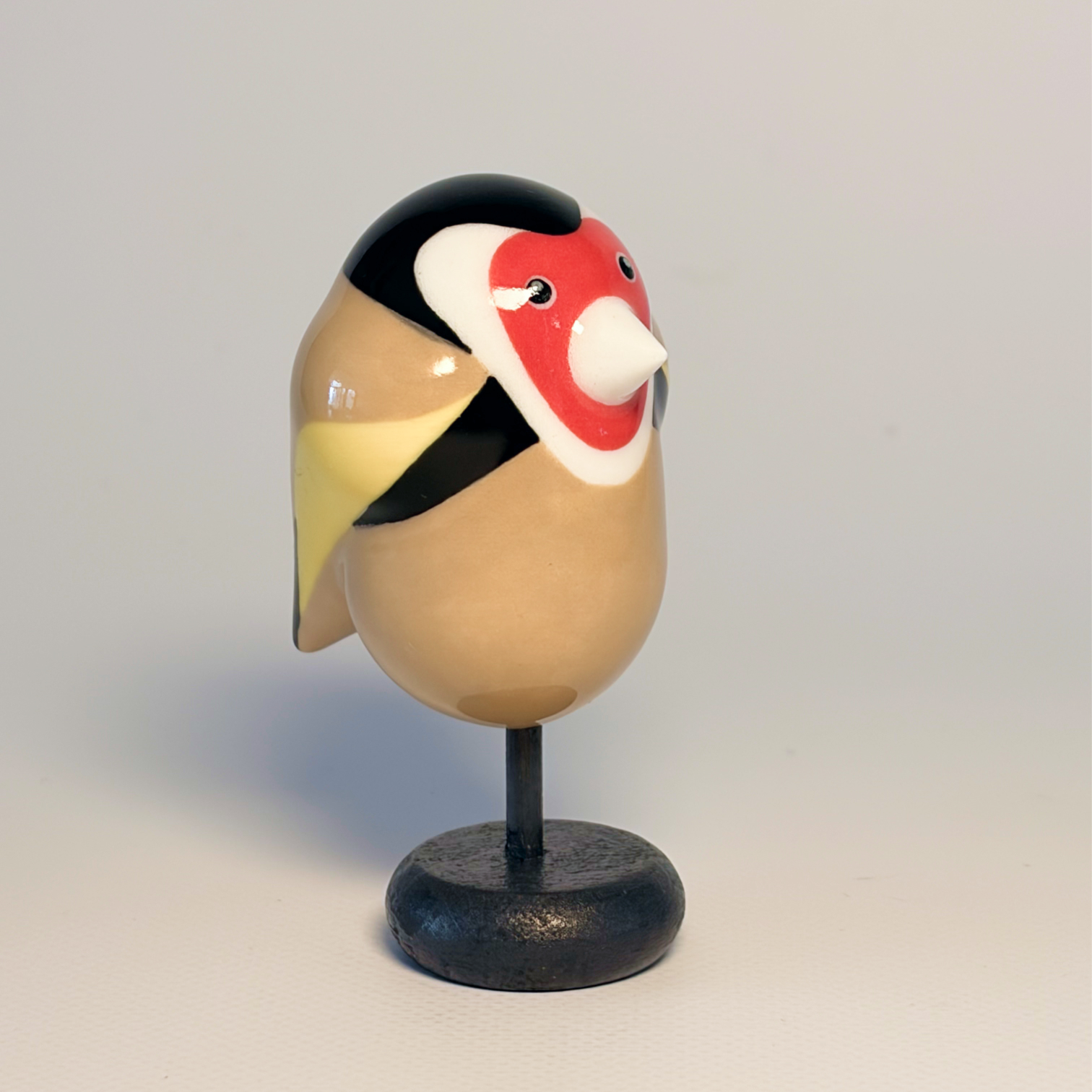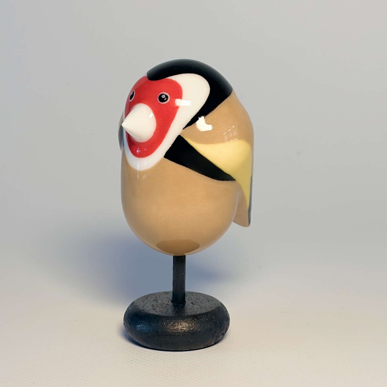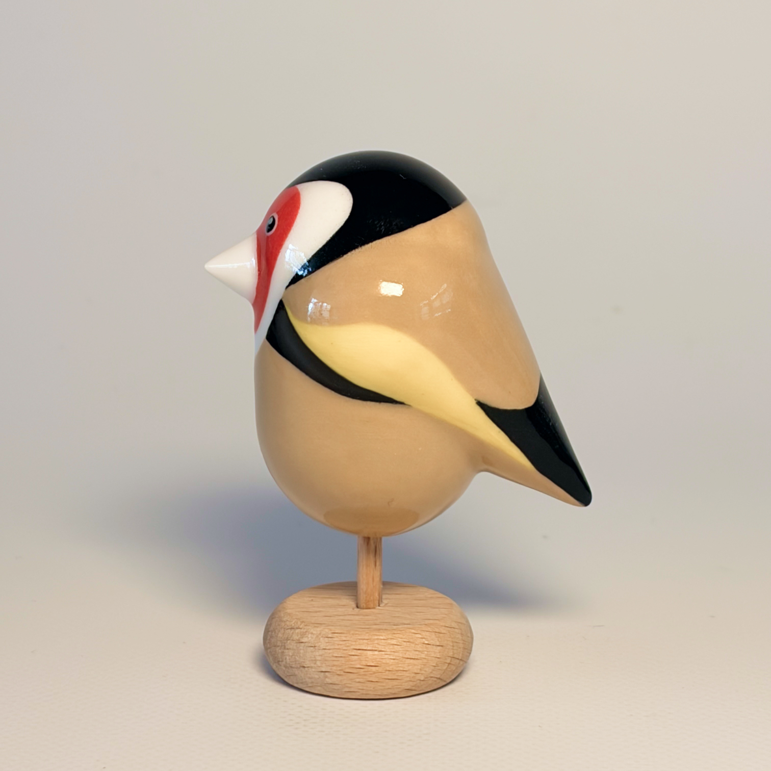 Small porcelain bird on a wooden stand (natural or black), painted with lots of care and dipped in a glossy transparant glaze.