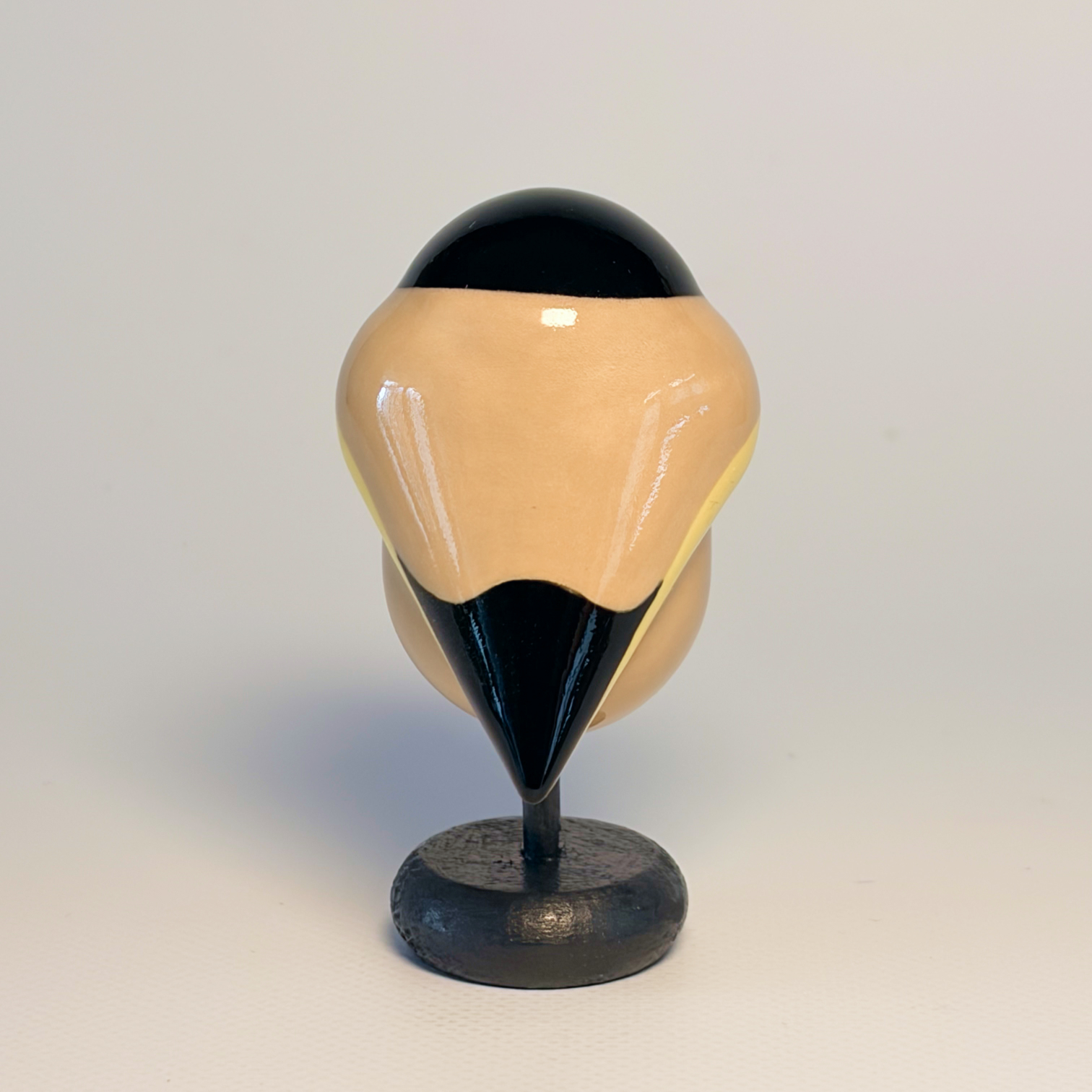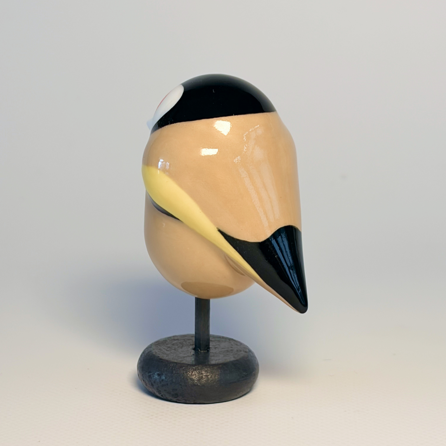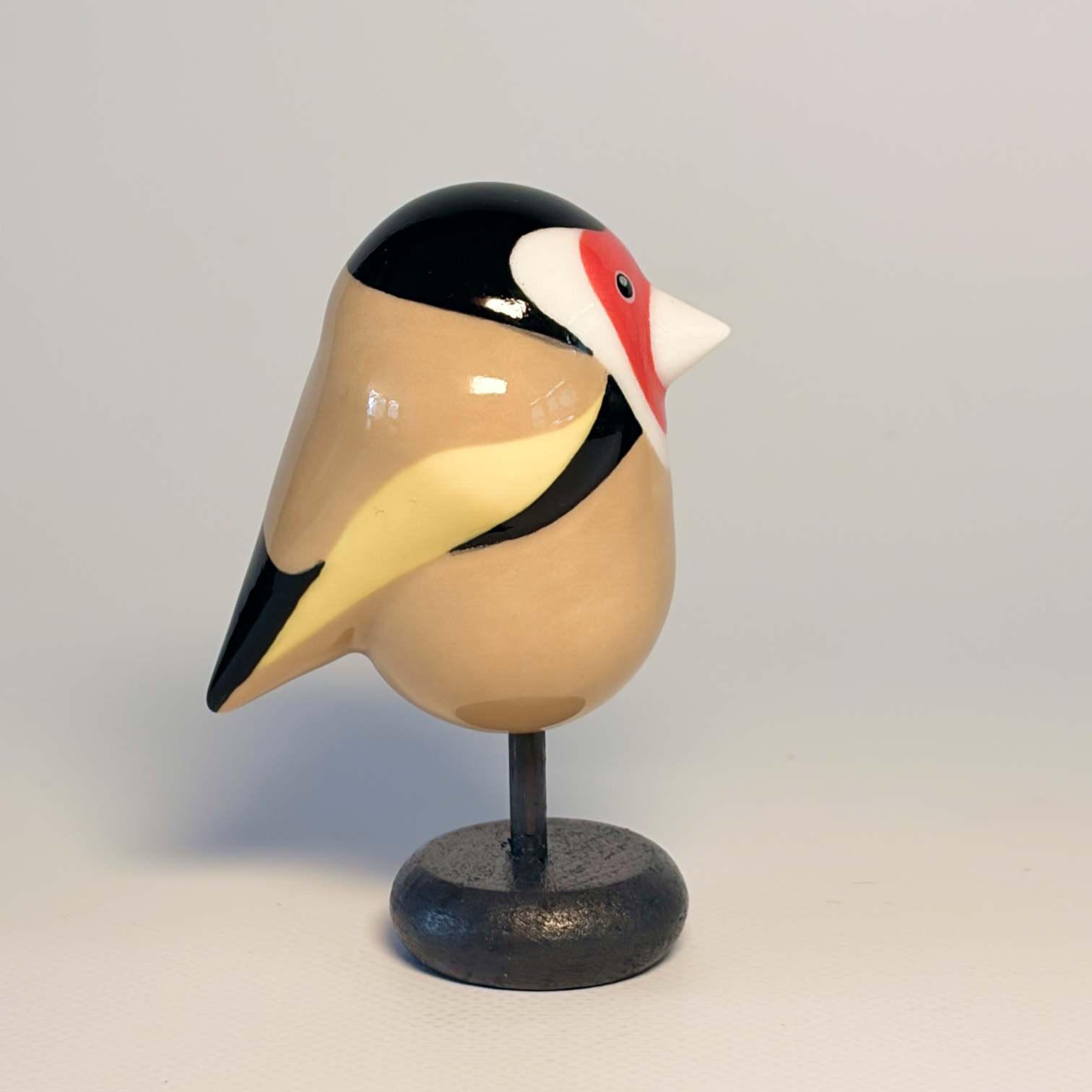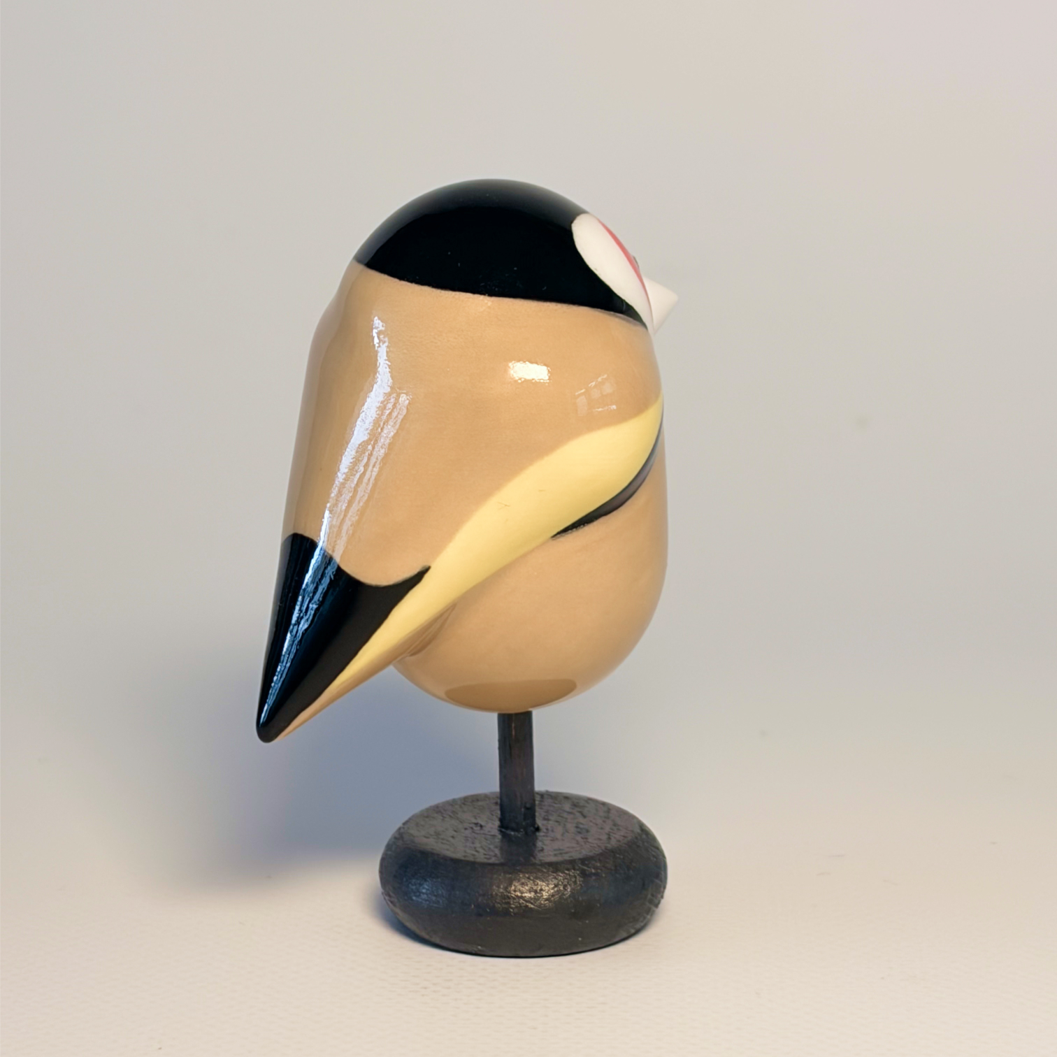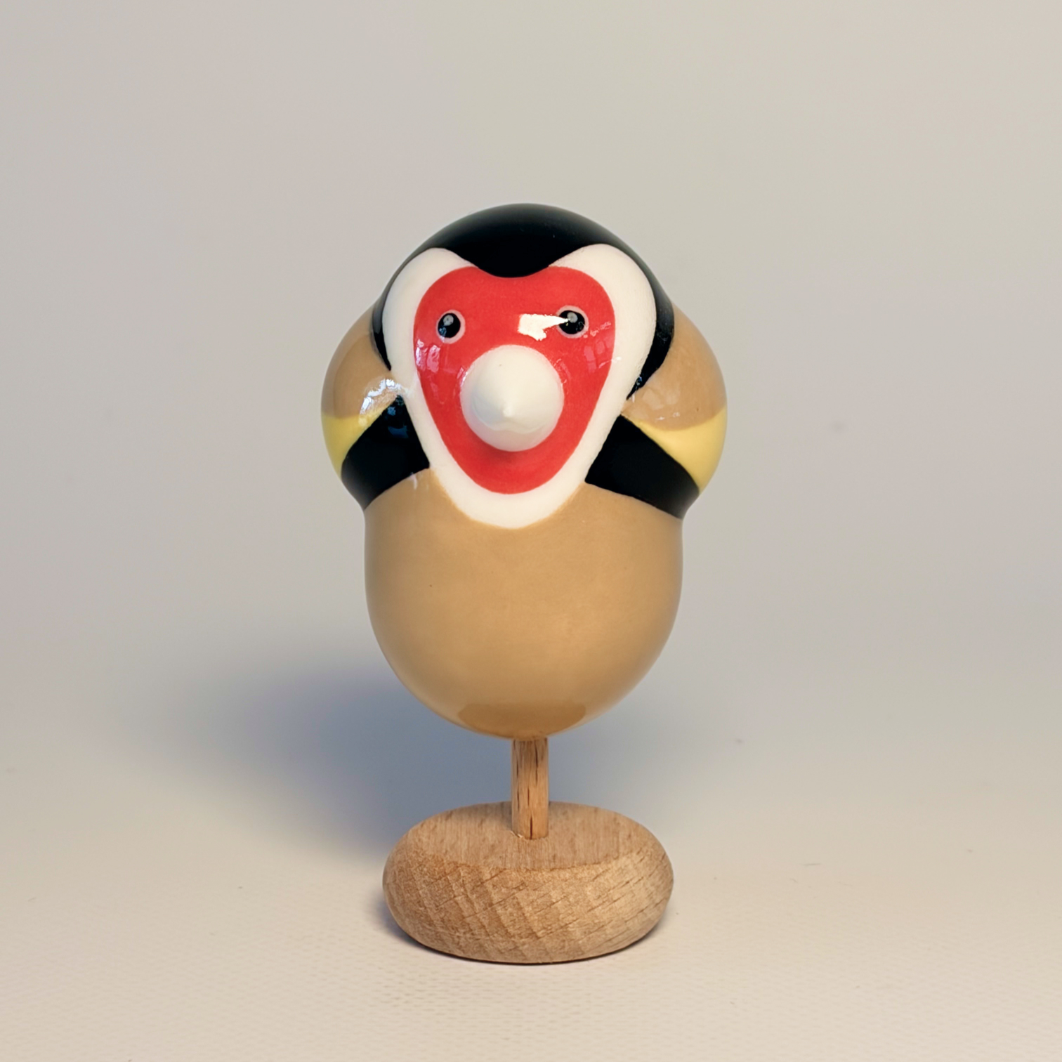Small porcelain bird on a wooden stand (natural or black), painted with lots of care and dipped in a glossy transparant glaze.