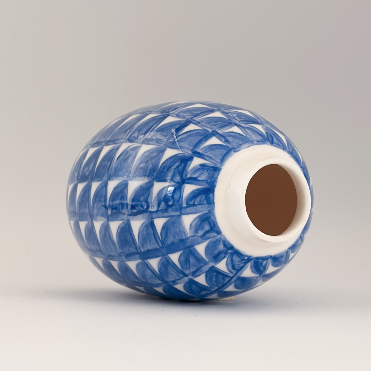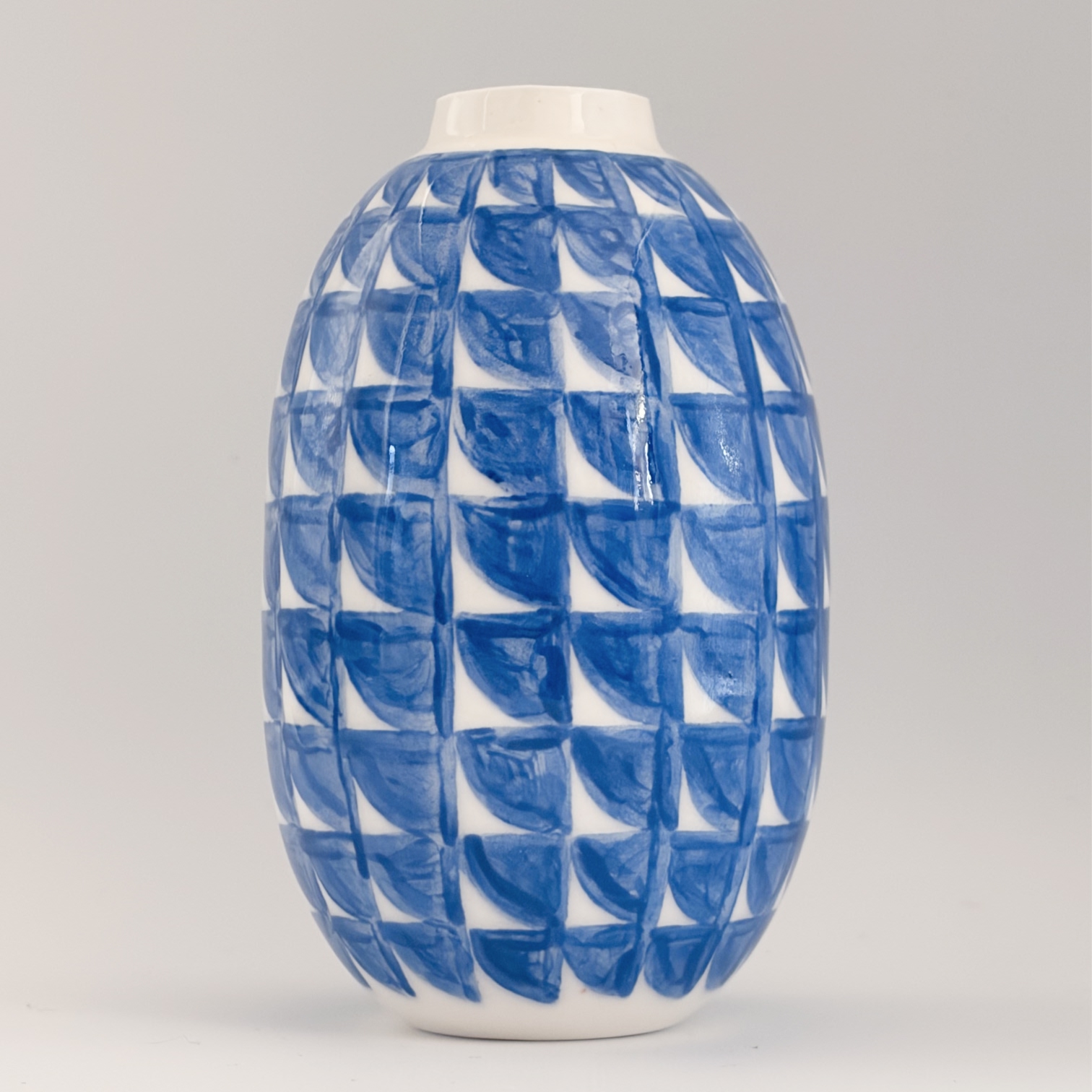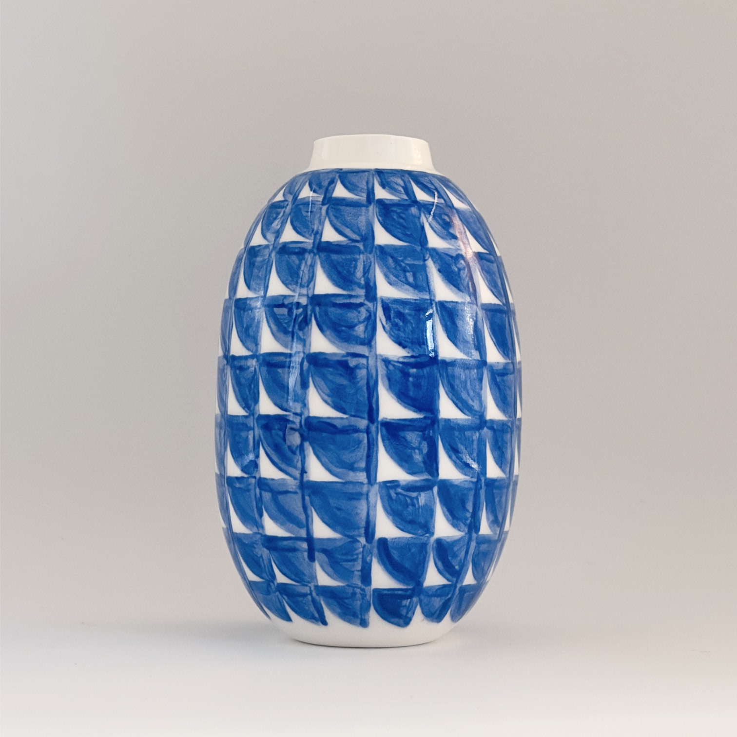 Small porcelain vase with a decoration of rounded blue squares, painted with lots of care and dipped in a glossy transparant glaze.