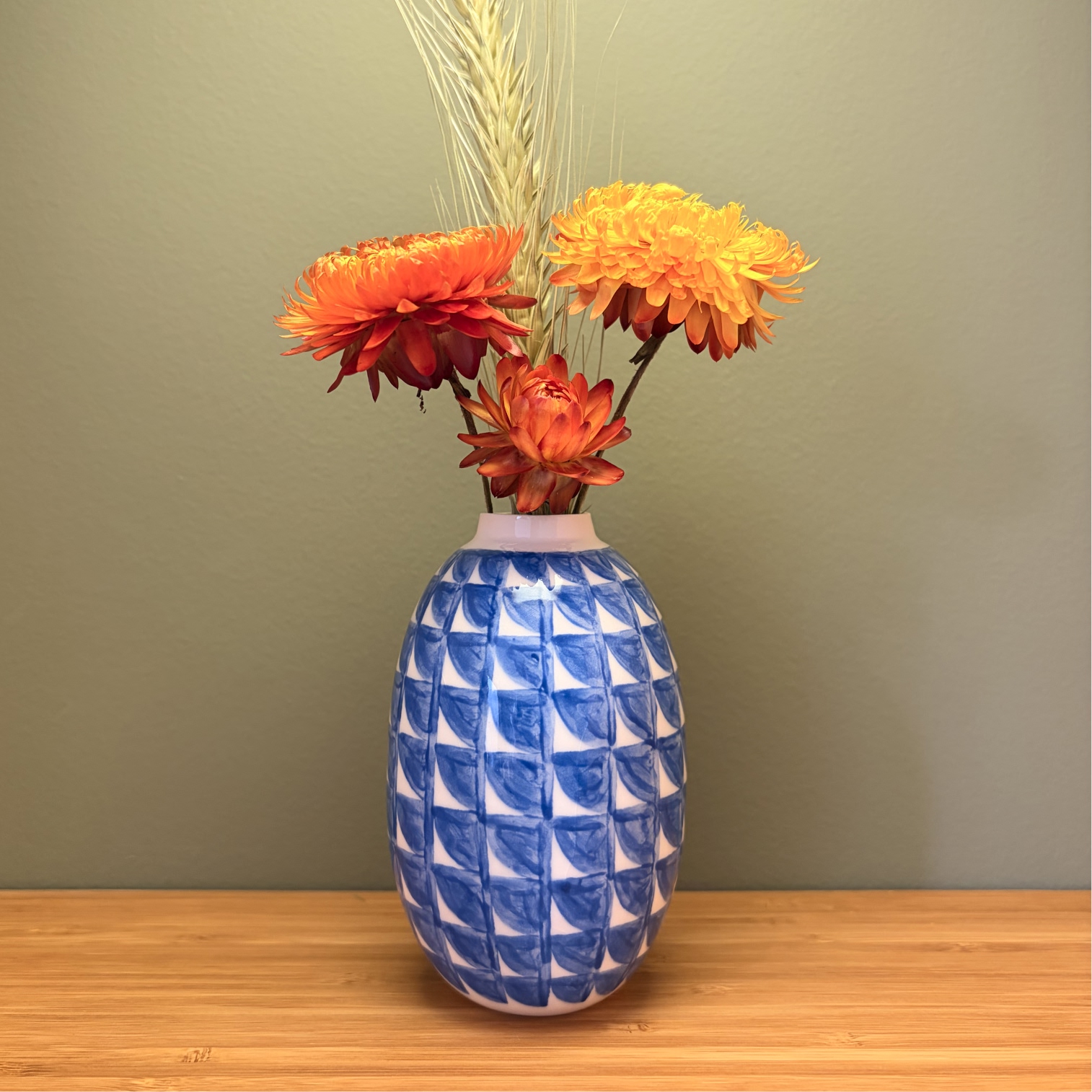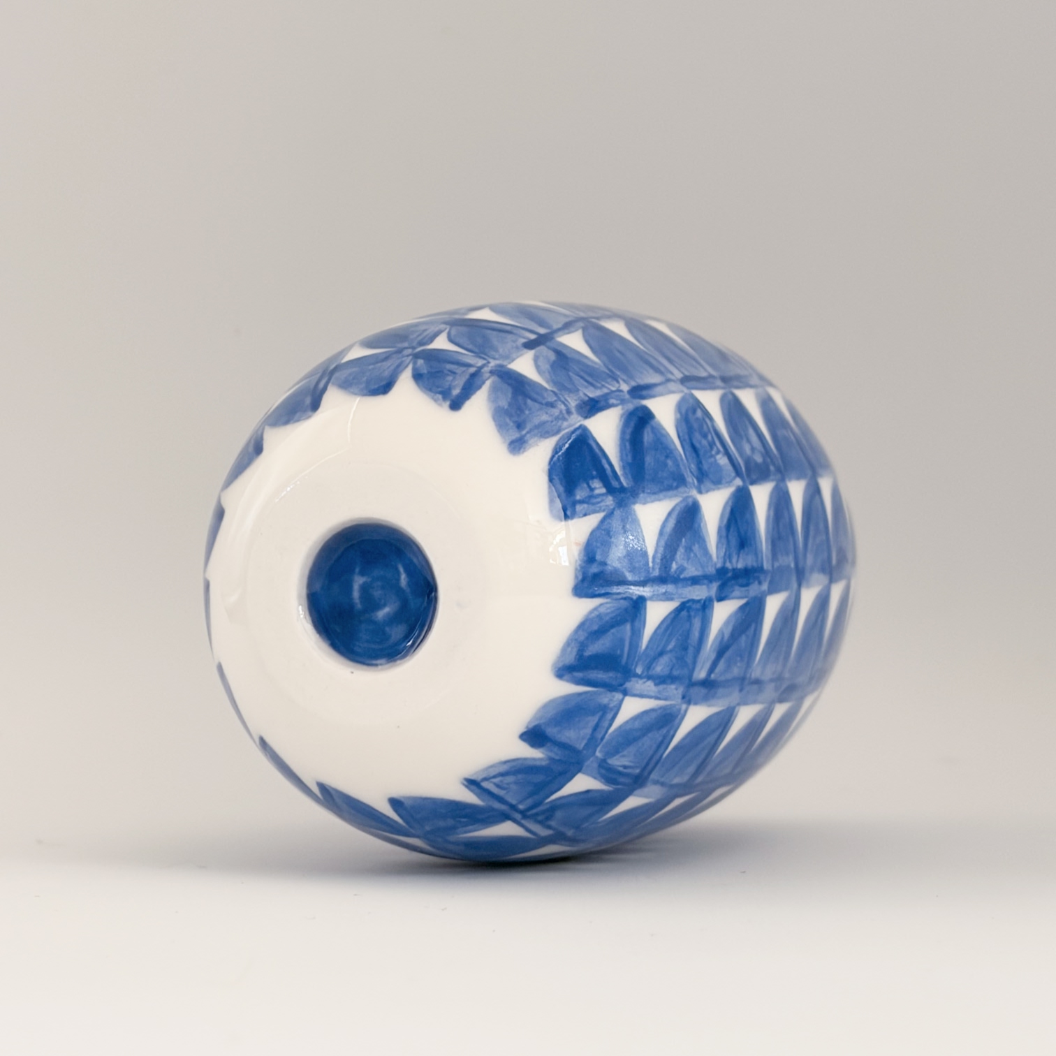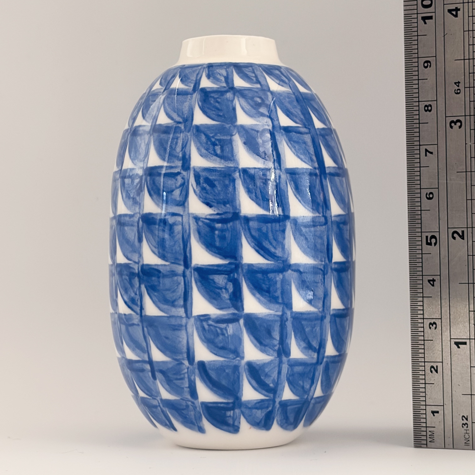 Small porcelain vase with a decoration of rounded blue squares, painted with lots of care and dipped in a glossy transparant glaze.