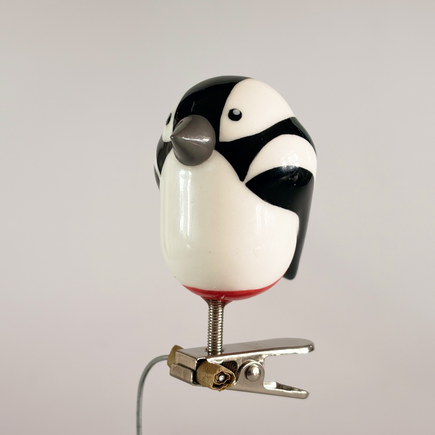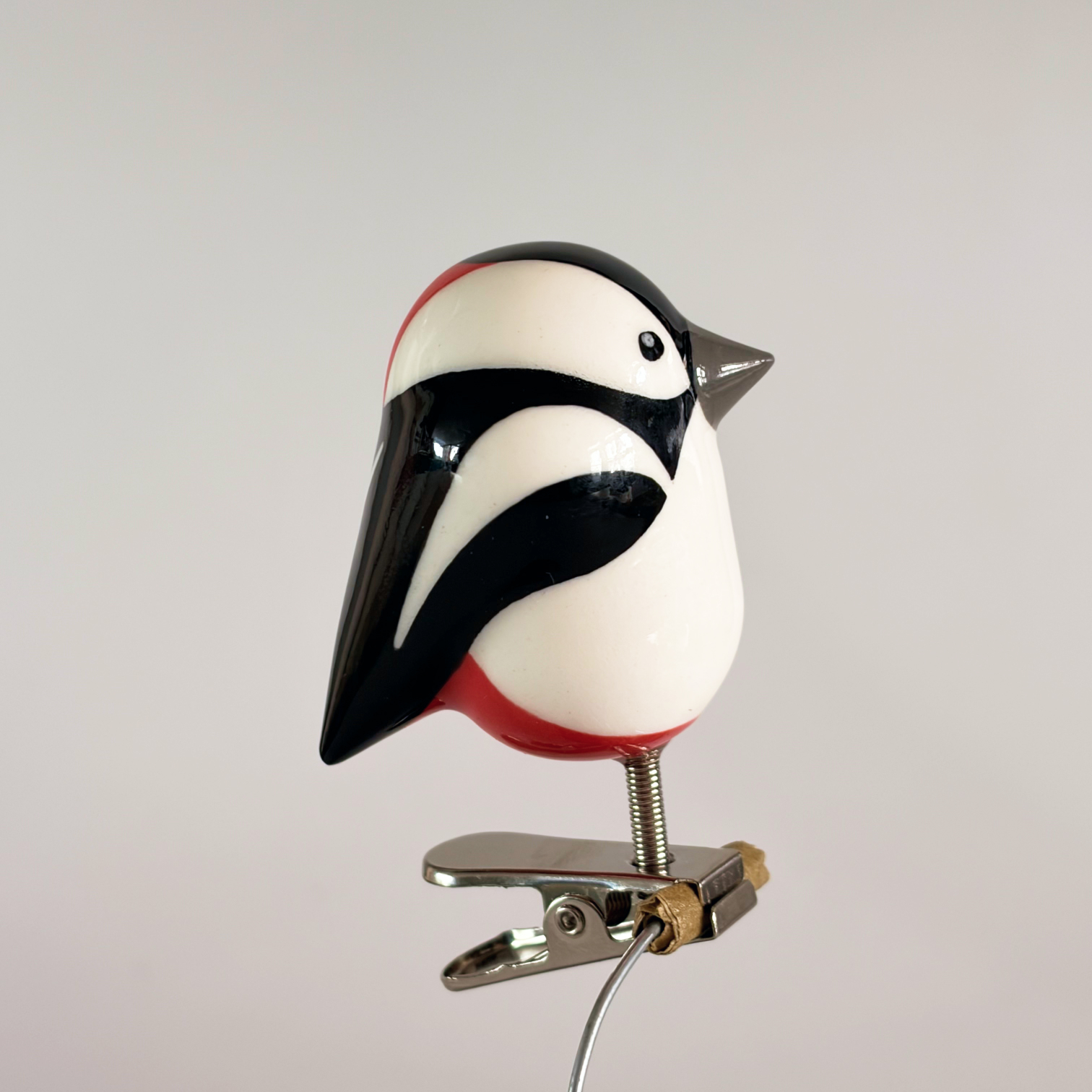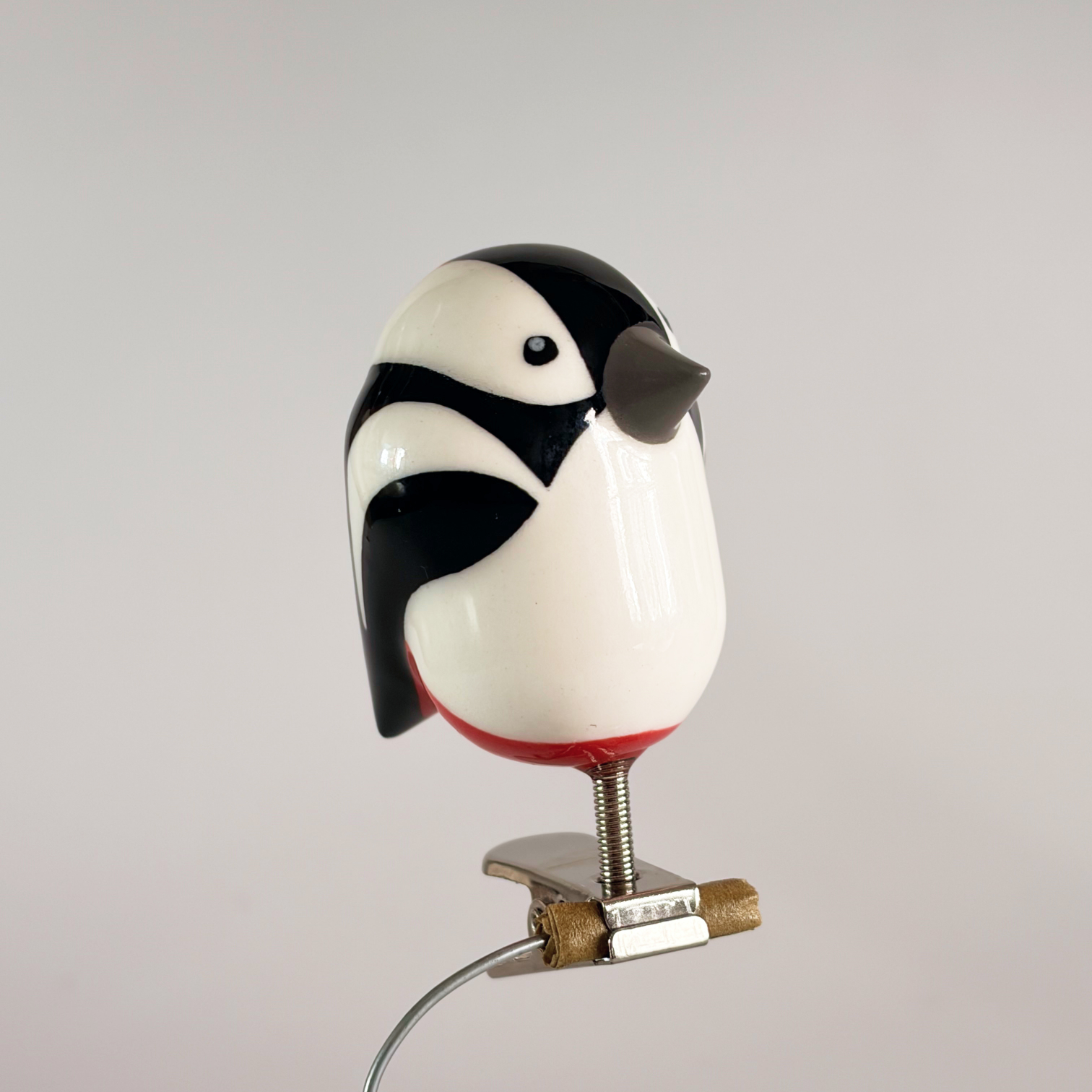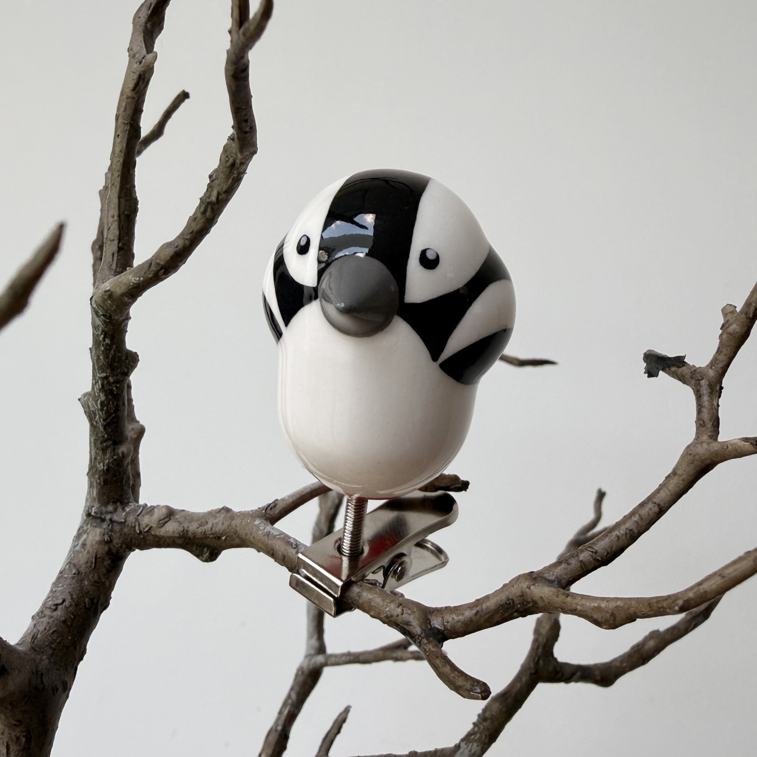 Small porcelain bird on a clip, painted with lots of care and dipped in a glossy transparant glaze.