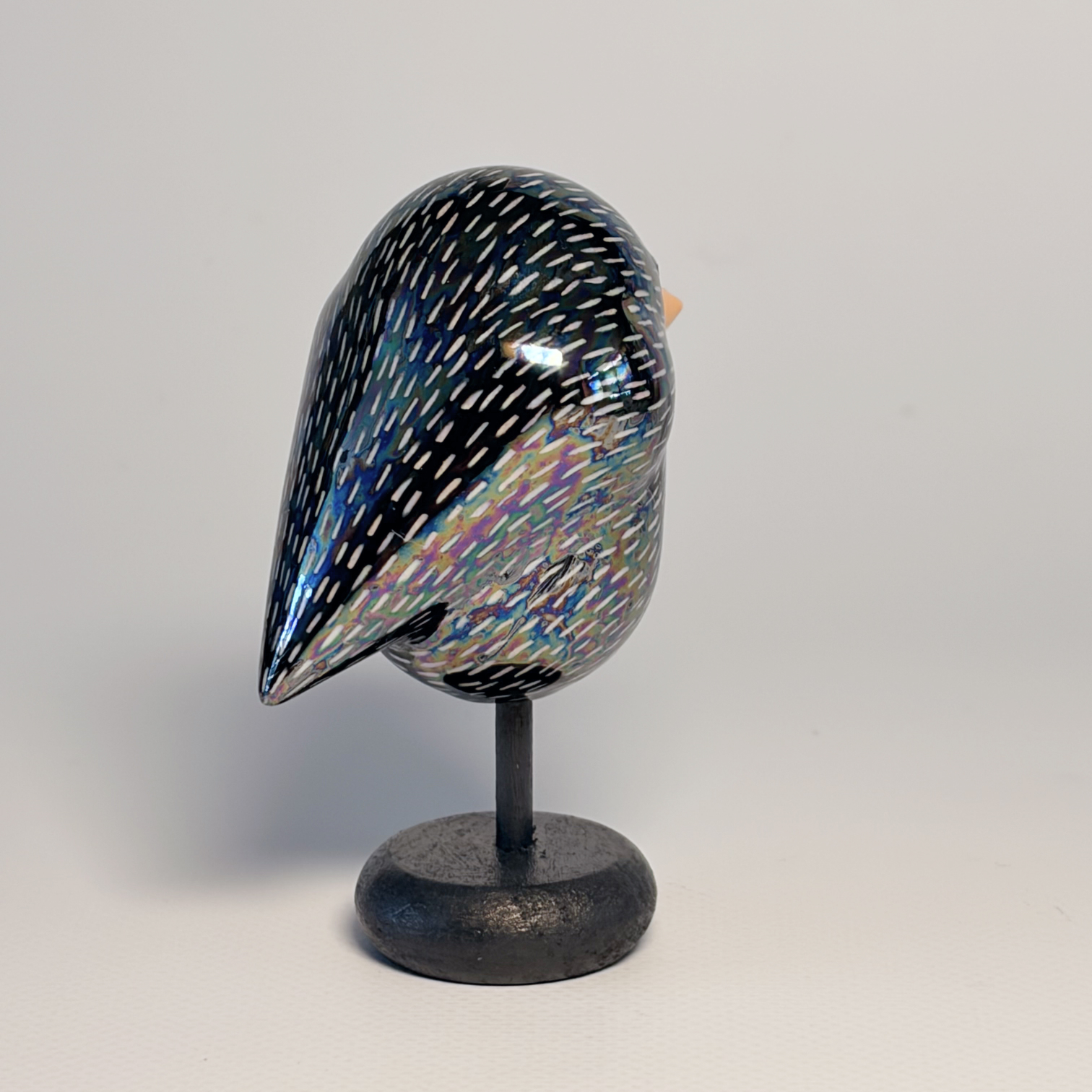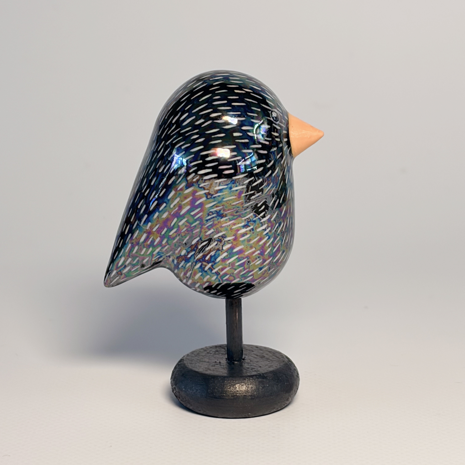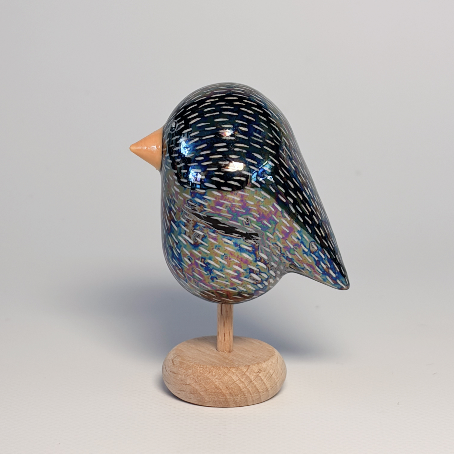 Small porcelain bird on a wooden stand (natural or black), painted with lots of care and dipped in a glossy transparant glaze. This bird is covered in a special pearl luster that is applied before an extra third fire in the kiln.