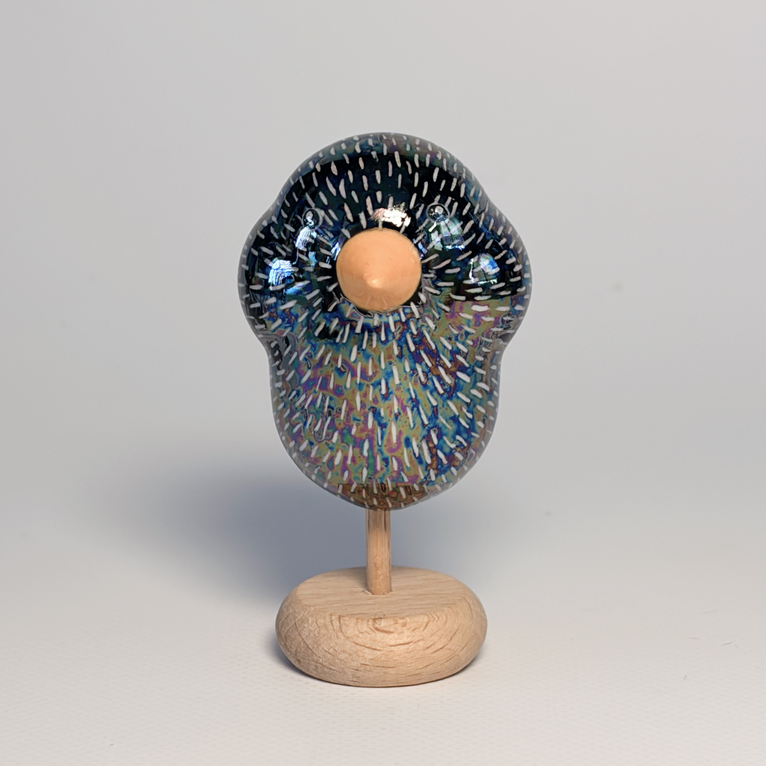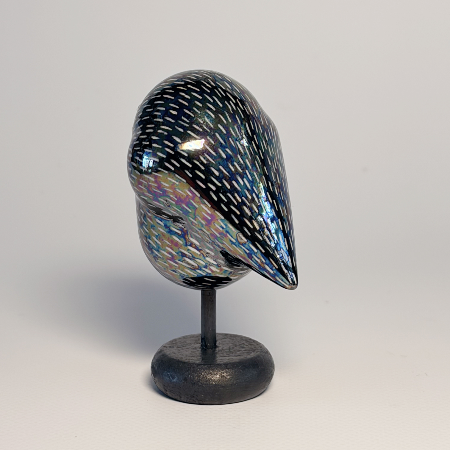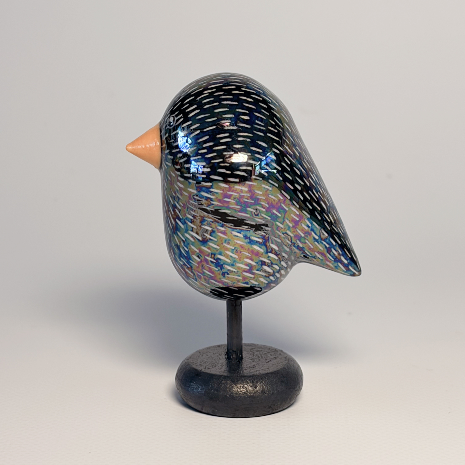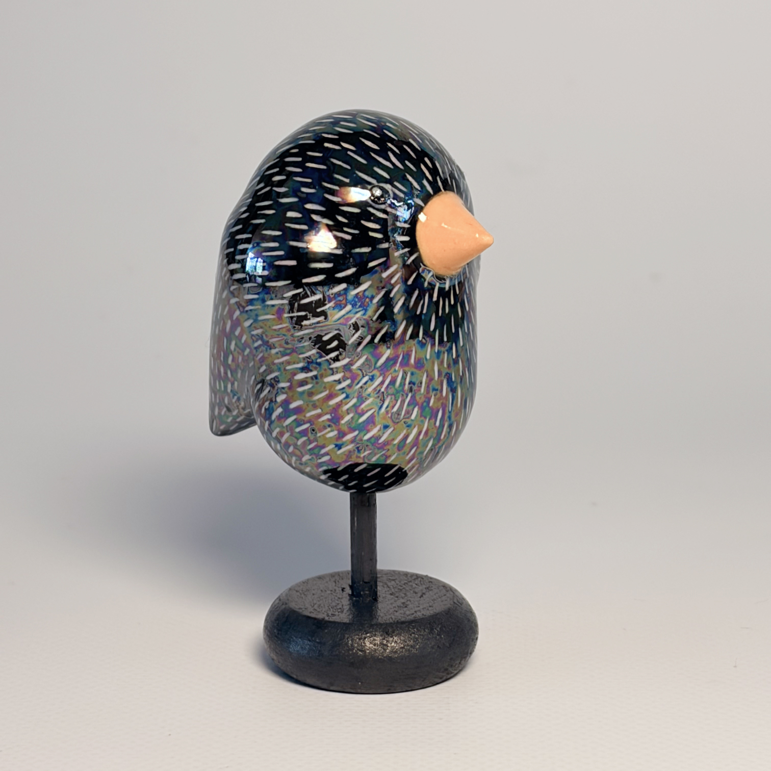 Small porcelain bird on a wooden stand (natural or black), painted with lots of care and dipped in a glossy transparant glaze. This bird is covered in a special pearl luster that is applied before an extra third fire in the kiln.