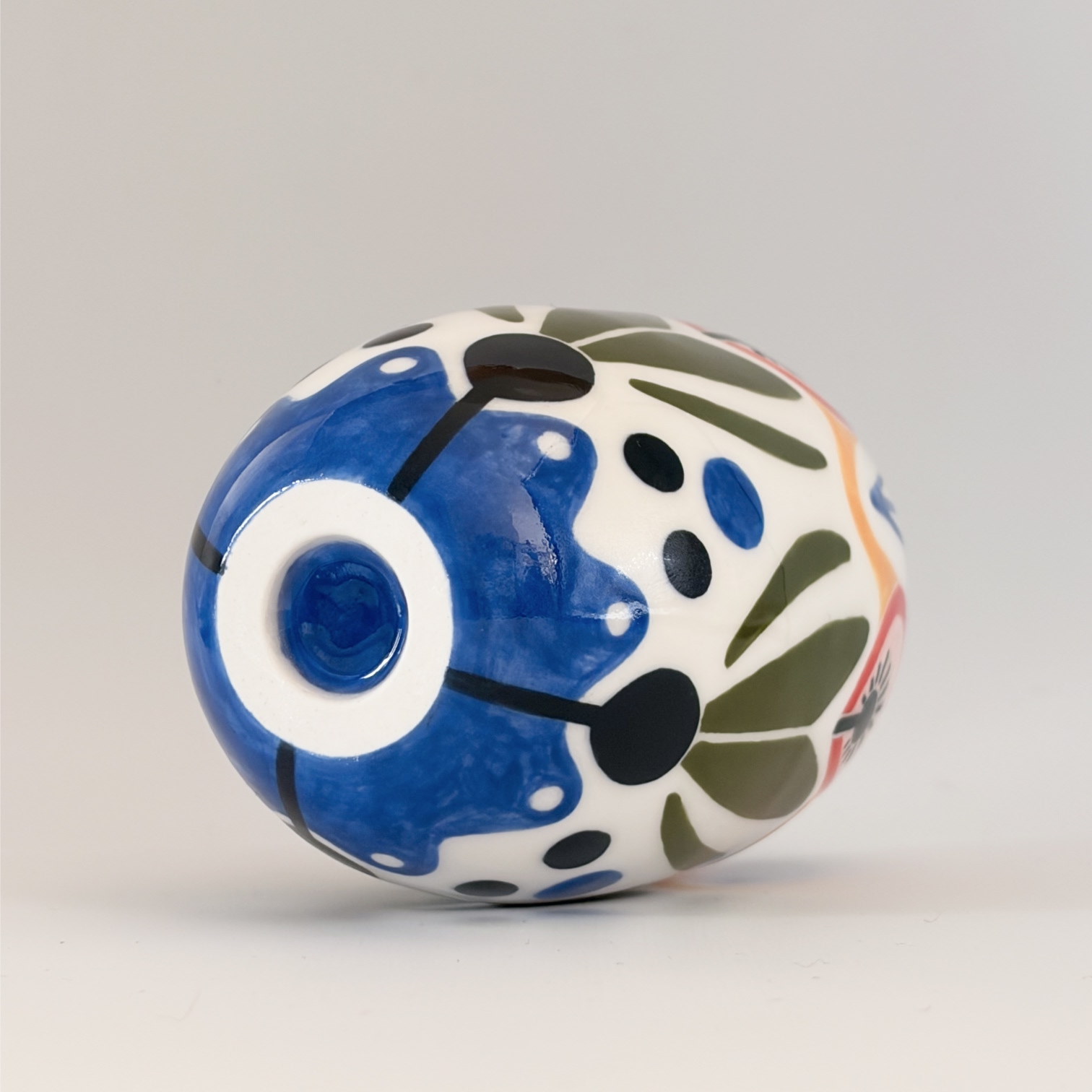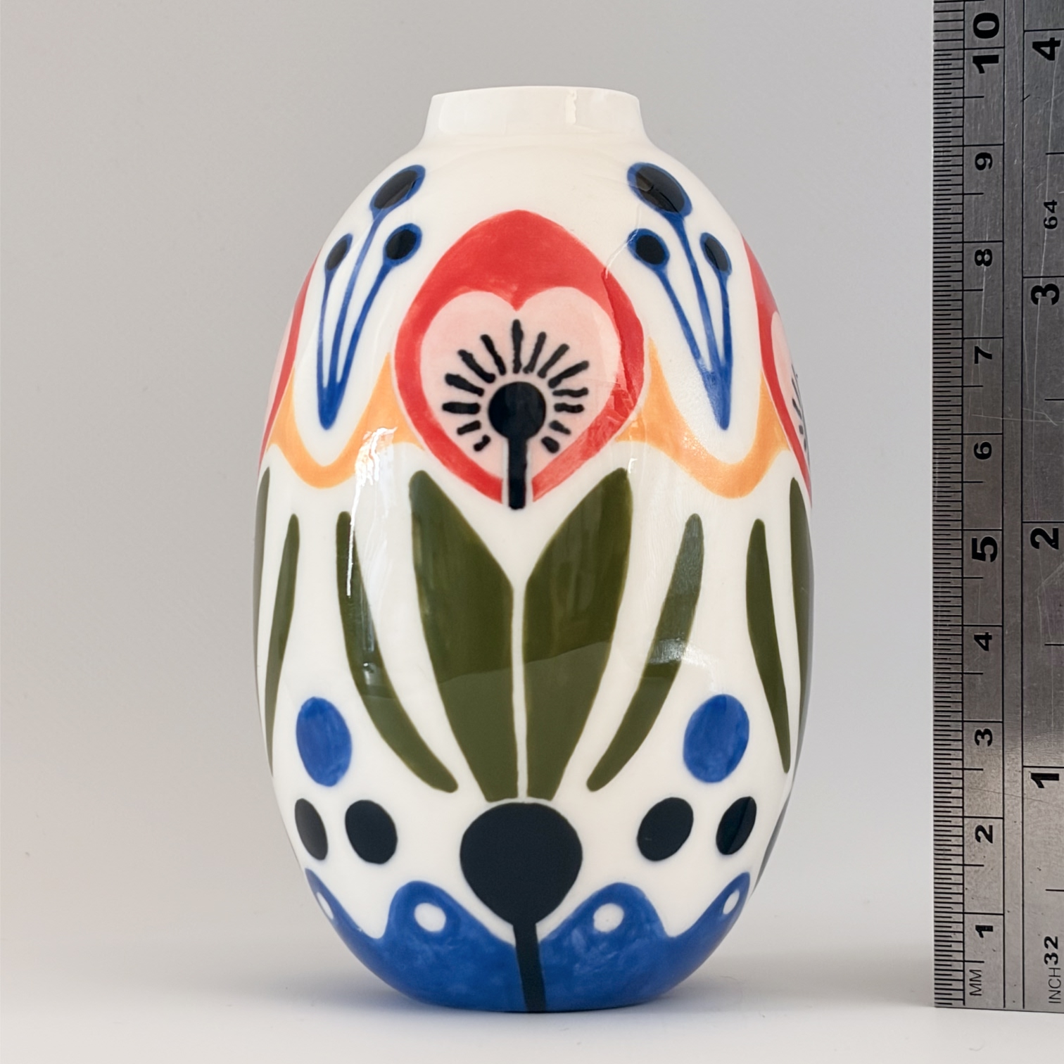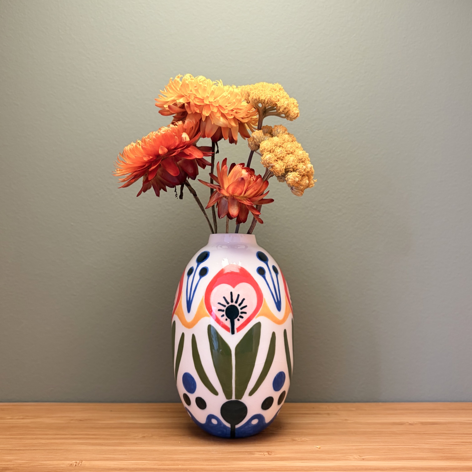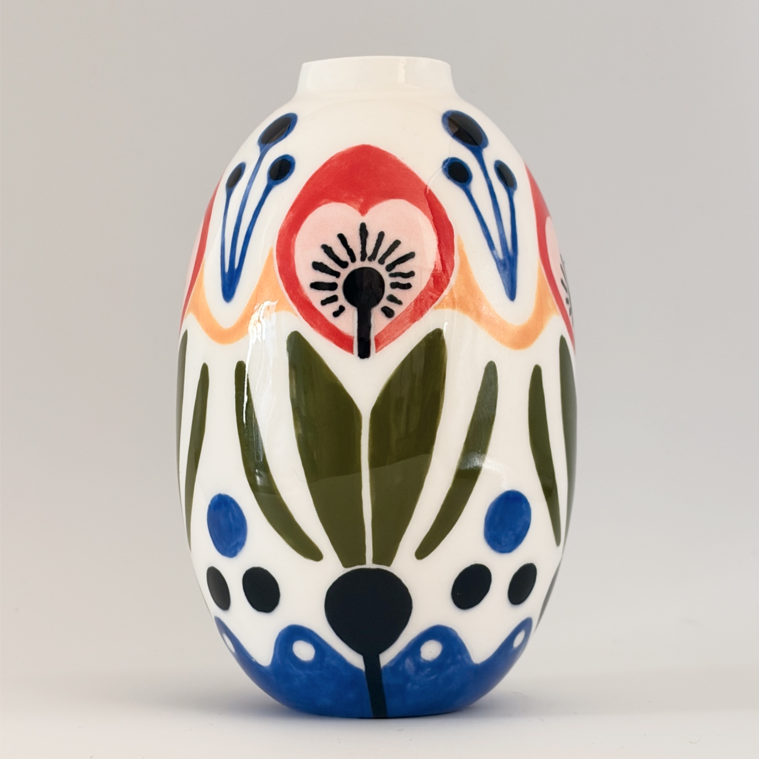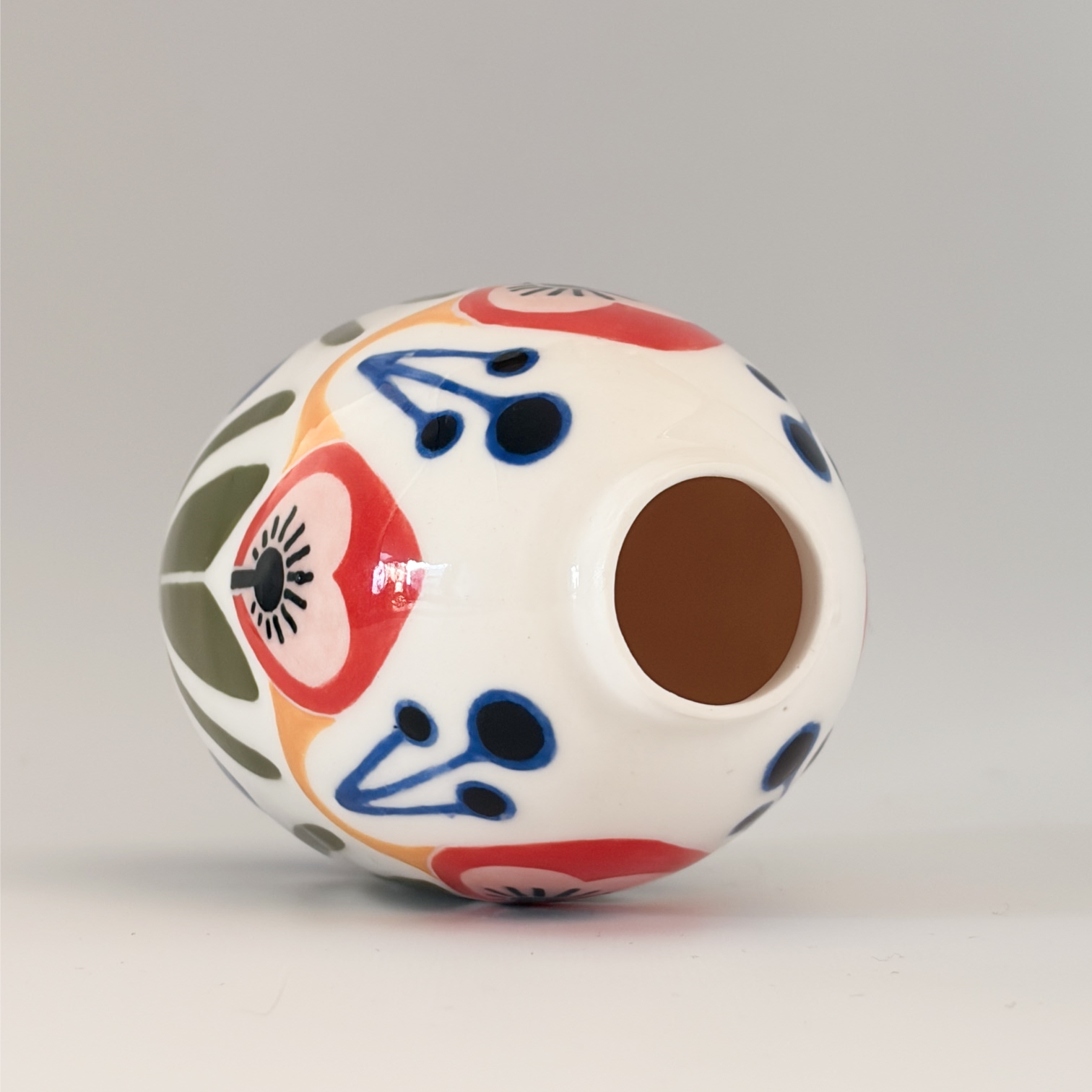 Small porcelain vase with a decoration of retro tulips, painted with lots of care and dipped in a glossy transparant glaze.
